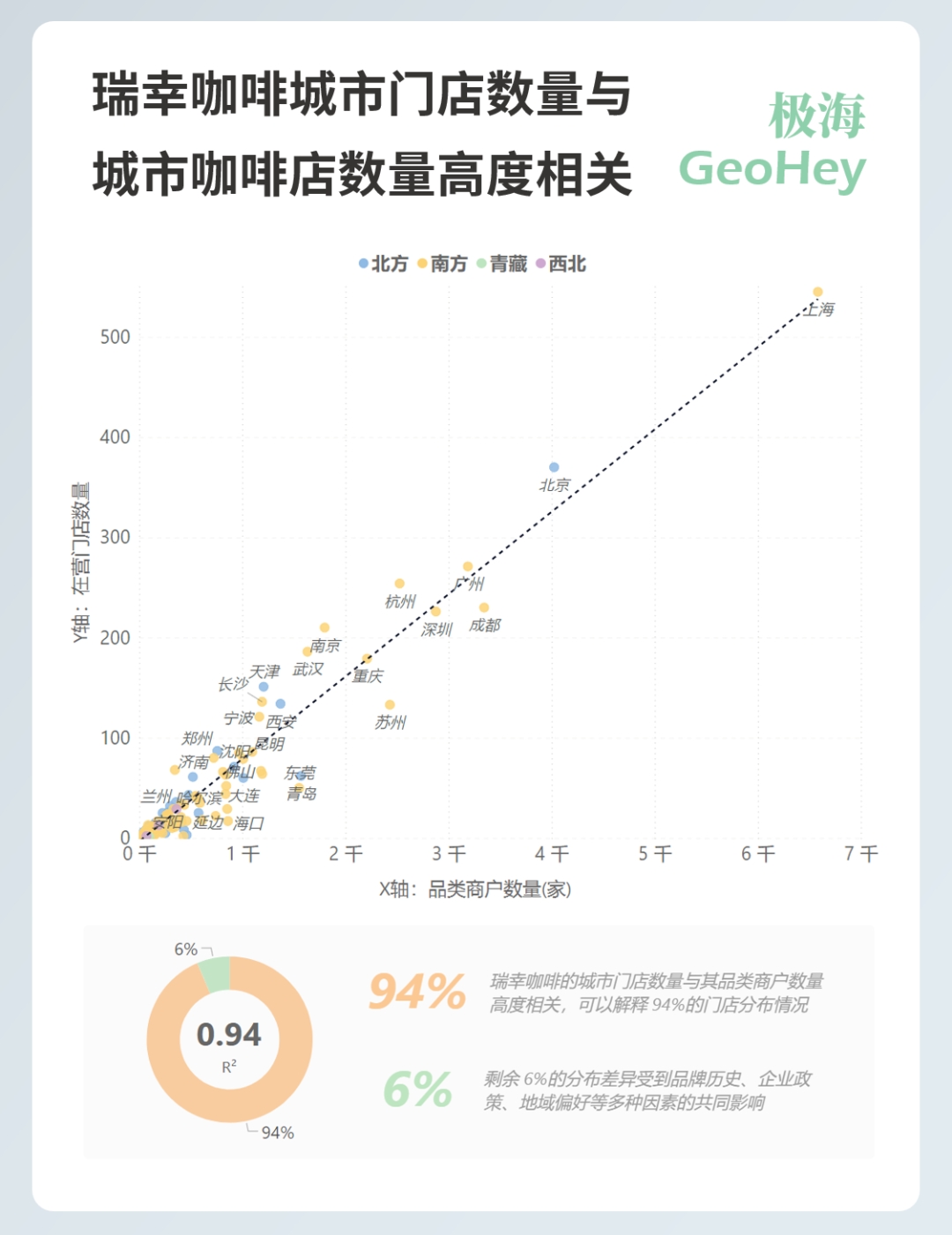 下图的横坐标是这个城市的咖啡品类规模,纵坐标是瑞幸咖啡的门店数量,二者基本分布在一条直线上,说明二者具有强相关性,R²决定系数更是高达0.94,粗略的估计,一个城市如果现存有120家咖啡店,瑞幸差不多就能开出10家店的水平。