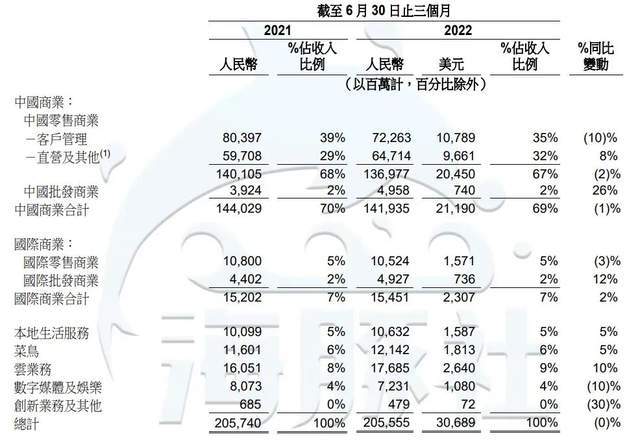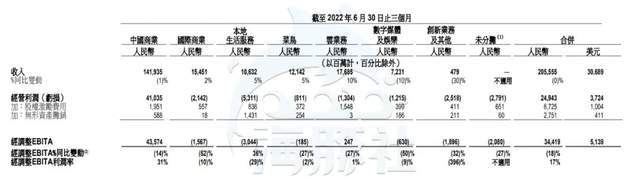 2023财年第一季度,阿里巴巴共实现营收2055.6亿元,同比下滑0.09%。其中,中国商业营收1419.4亿元,同比下滑1%;国际商业154.5亿元,同比增长2%;本地生活106.3亿元,同比增长5%;菜鸟121.4亿元,同比增长5%;云业务176.9亿元,同比增长10%;数字媒体及娱乐72.3亿元,同比下滑10%;创新业务及其他4.8亿元,同比下滑30%。
