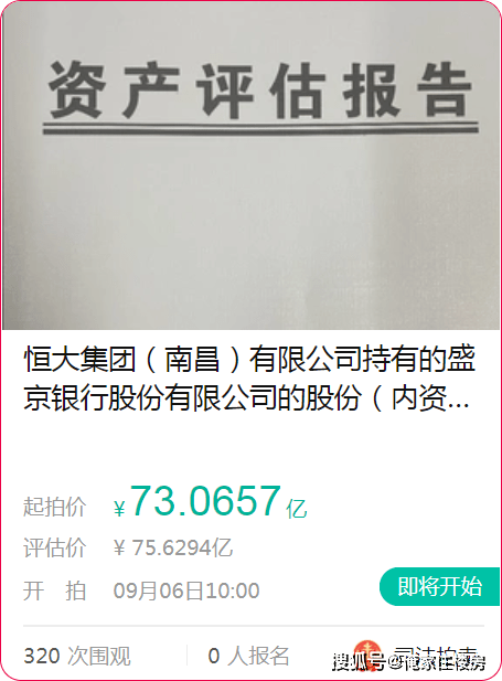 据上述平台拍卖公告显示:辽宁省沈阳市相关部门将于9月6日10时至9月7日10时,拍卖“恒大南昌分公司”持有的1,281,855,435股“盛京银行”股份(内资股),评估价和起拍价分别约为75.63亿元(7,562,947,100.00元)和73.07亿元(7,306,575,979.50元)!