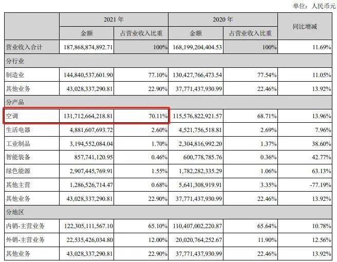 可即便如此,格力的空调营收也在2021年被美的反超,2021年美的全年营收3434亿元,空调业务贡献了1418亿元,而格力引以为傲的空调业务仅营收1317亿元,相差101亿元。