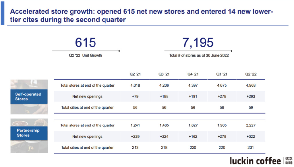从门店数量来看,瑞幸的扩张保持着稳中有进的合理节奏。截至二季度的7195家门店中,4968家为自营门店,2227家则为联营门店。
