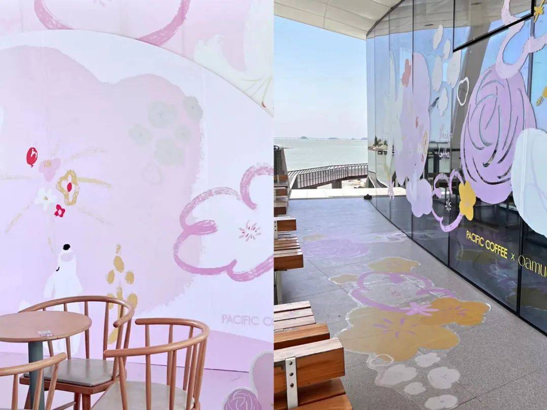 店里的咖啡师告诉我,这是太平洋咖啡联名插画艺术家卤猫打造的“繁花”主题店,融入了卤猫以往自由、治愈的风格。