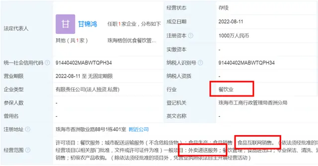 据天眼查APP显示,8月11日,珠海格创优食餐饮管理有限公司成立,法定代表人为甘锦鸿,注册资本1000万人民币,经营范围含外卖递送服务;餐饮管理;日用品销售;礼品花卉销售;农副产品销售;初级农产品收购等。