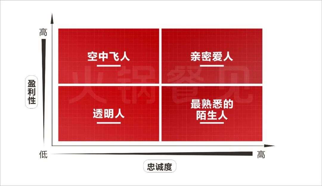 客流量对营业额的影响极大,没有客流量,后面的所有参数都毫无意义。要提升客流量,必须先分清顾客类型。按照顾客对火锅店的“忠诚度与盈利性”划分,可分为4类群体。