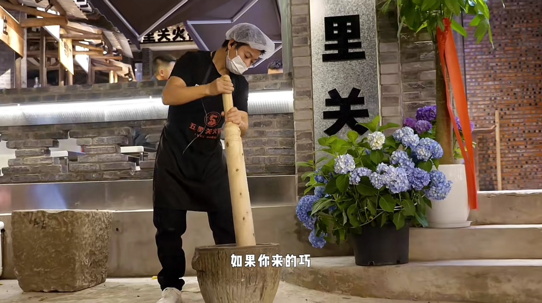 有的火锅店会在店外炒料,大型的炒锅来回翻腾,香味飘散,很吸引人,像五里关火锅,逢到饭点,服务人员就在门口锤蒜泥、打糍粑,反复捶打的动作,远远就能看到。