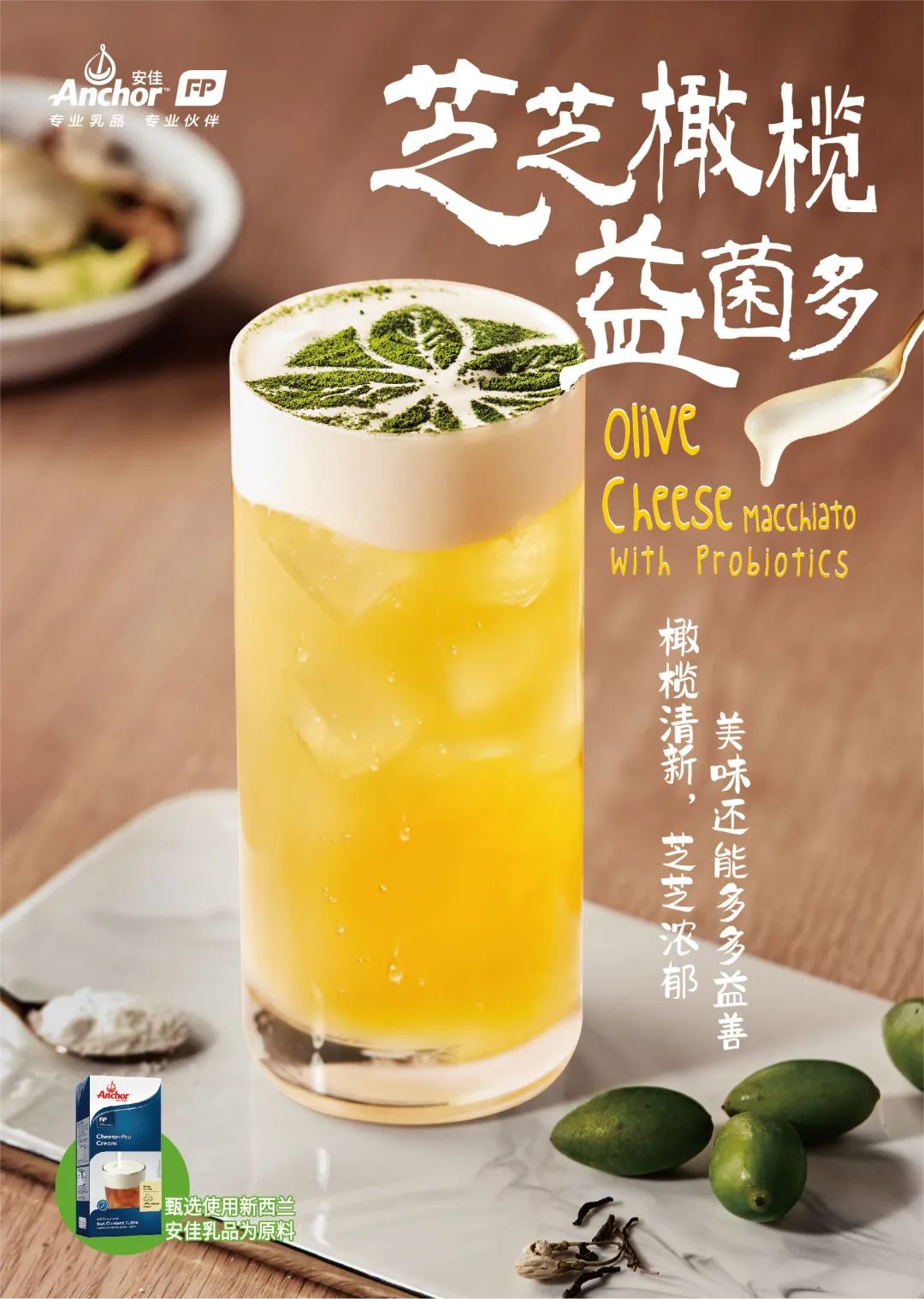 安佳专业乳品研发给了一个思路是增加健康属性。他们研发过一款“芝芝橄榄益菌多”,在安佳稀奶油做成的奶盖中融入益生菌粉,抓住年轻人的健康需求,为产品提供新的卖点。