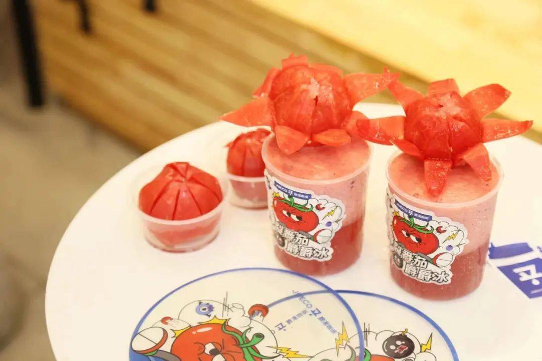 爵渴咖啡最近刚上新一款“爆炸番茄爵爵冰”,刚推出就被纷纷打卡,利用新鲜番茄和椰子水冰打成冰沙,顶部是一颗糖渍番茄,用的是今年很火的“一整个”卖点。