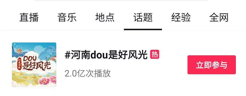 旅界注意到,云台山的多个视频也都带上了“河南DOU是好风光”的话题。截至发稿时为止,这一话题的累计播放量已经达到2亿,云台山的多个视频都上榜了该话题热门视频。