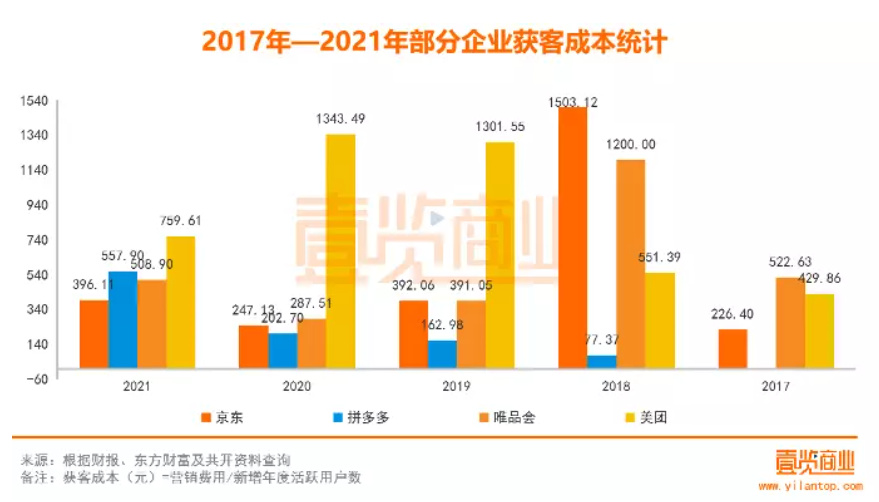 如果按照营销费用除以新增活跃用户数的方式估计获客成本的话,拼多多在2018至2021年的获客成本分别为:77.37元、162.98元、202.70元和557.90元。按照这个算法,最新一个季度京东的“营销费除以新增用户数”,已经达到805元一个用户。