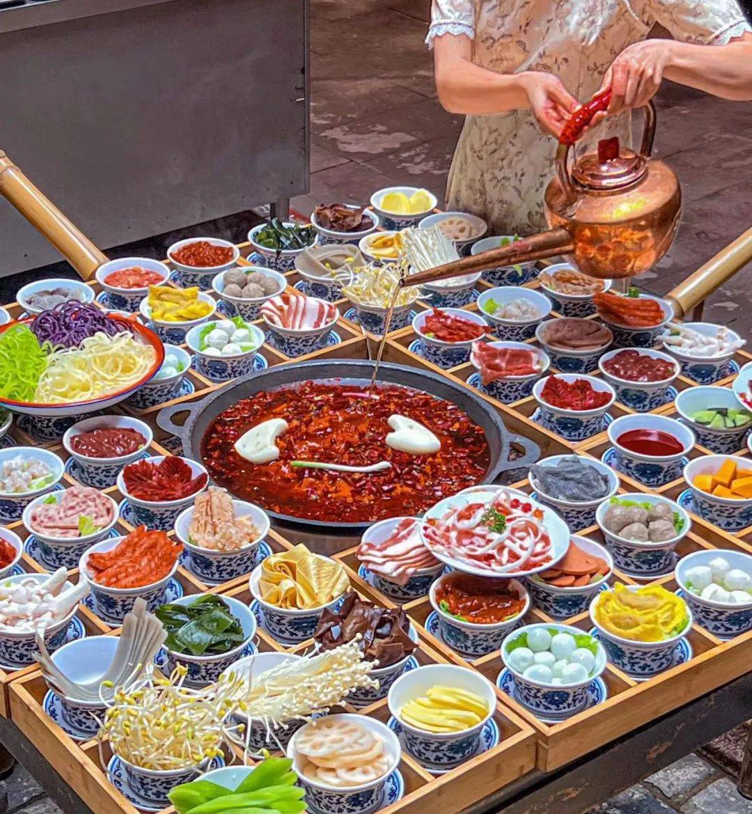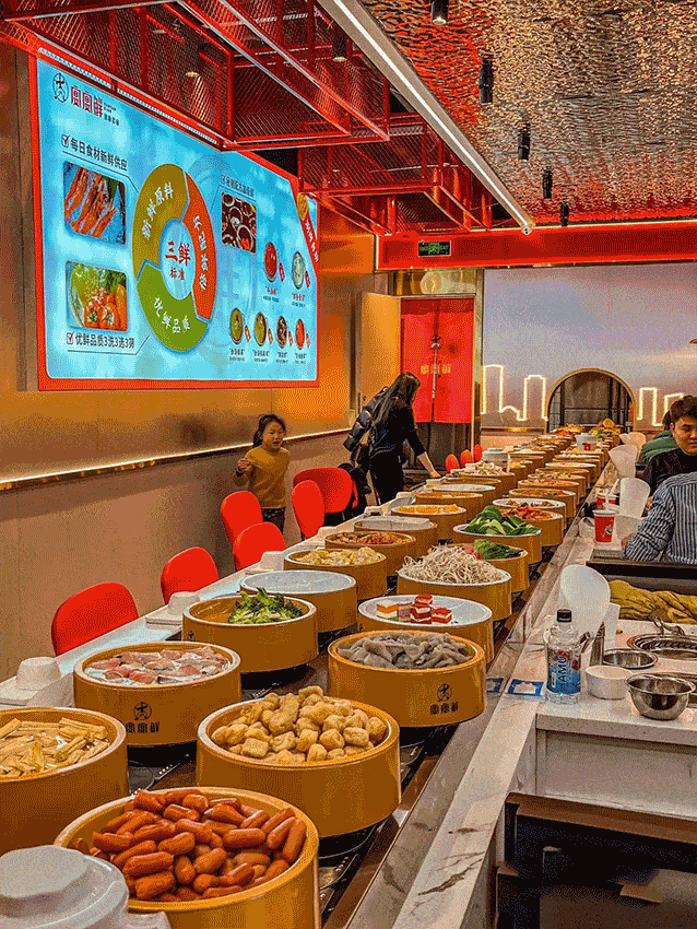 透明橱窗、自助取餐的方式,本质也是让顾客多点菜,青翠欲滴的蔬菜、新鲜的牛羊肉、各类颜色的菌菇、形状各异的丸滑……很容易吸引顾客眼球,顾客也会下意识地多拿一些菜。