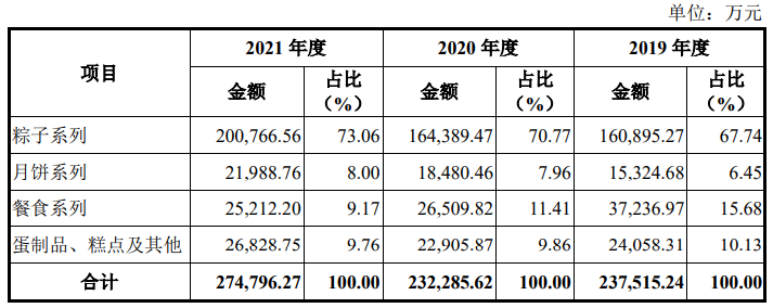 招股书显示,从2019年到2021年,五芳斋产品中粽子系列占比分别为67.74%、70.77%和73.06%,对粽子的依赖不减反增。可以说,五芳斋的业绩几乎是靠卖粽子撑起来的,多年如此。