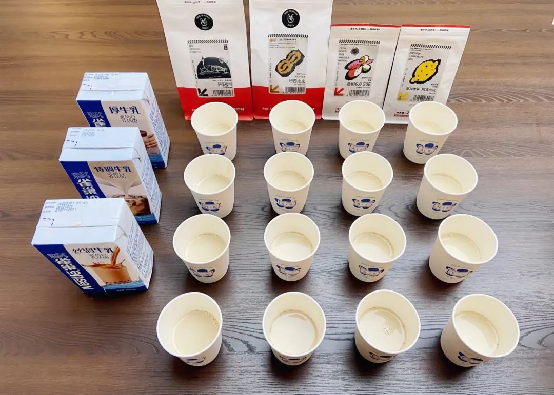 将雀巢丝滑牛乳、厚牛乳、特调牛乳等3款不同风味乳基底,与门店常用的深烘 (坚果风味) 、深烘 (花香风味) 、中烘、浅烘 (耶加雪菲) 搭配做产品,邀请18位消费者盲测,确定受欢迎的咖啡风味特征。