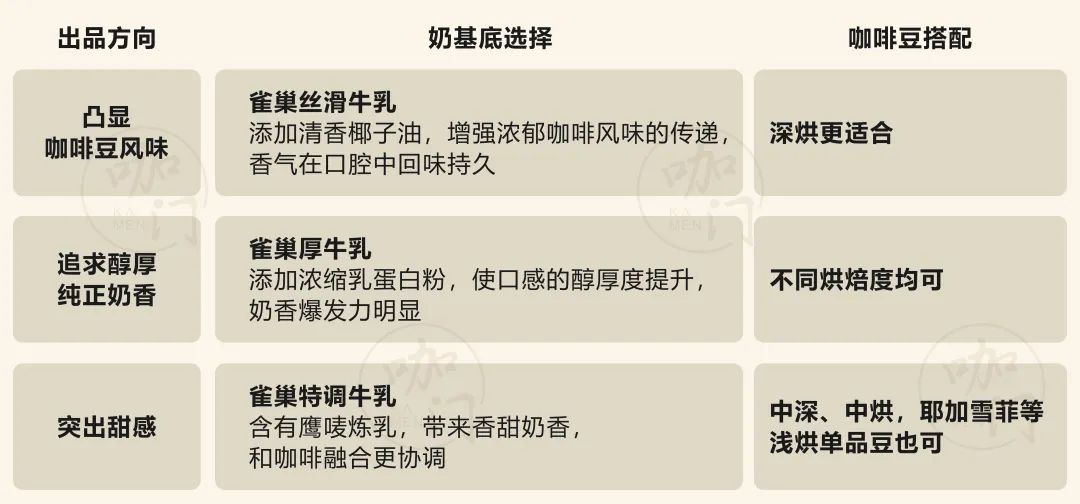 可以发现,不管是甜感、奶香味,还是咖啡豆风味的凸显,这些受消费者欢迎的要素,都是通过合适的乳制品选择,让一杯咖啡产品有更明确的风味表现。