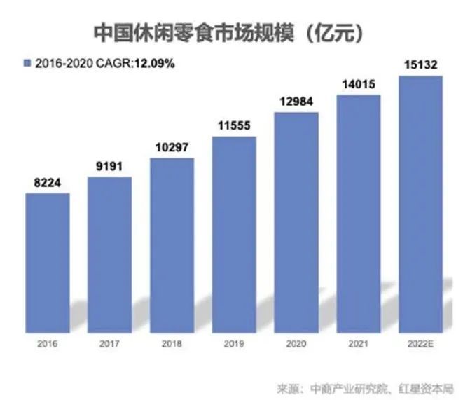 根据红星资本局发布的《2022年中国休闲零食行业研究报告》,从2016年开始,休闲零食的市场规模就稳步增长,年复合增长率达到12.09%,预计2022年将突破15000亿元。