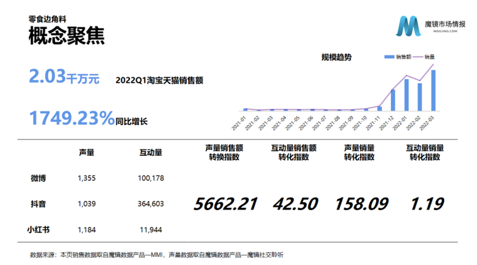 更为清晰的数据则来自于魔镜市场情报发布的《2022Q1消费新潜力白皮书》,报告显示:从2021年1月到2022年3月,在微博、抖音、小红书等平台,零食边角料的发帖数量(报告中所谓“声量”指标)普遍在1000出头,但转、评、赞、收等互动却数以万计。