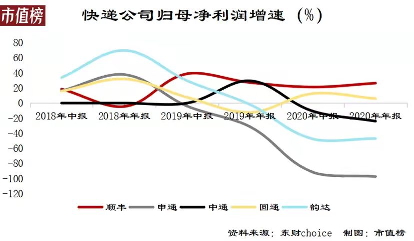 这一年,快递行业的增速来到了31%,中通、韵达、申通作为电商快递高景气度的直接受益者,在业务量维持高增长的情况下,盈利却出现了负增长,只有圆通勉强维持住了6%的归母净利润增长。
