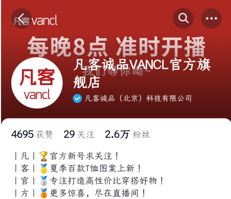 其中,在经营主体是凡客诚品(北京)科技有限公司的官方账号,“每晚八点,准时开播”的字样非常醒目。此外,账号积累的短视频数量也已经超过三百条。
