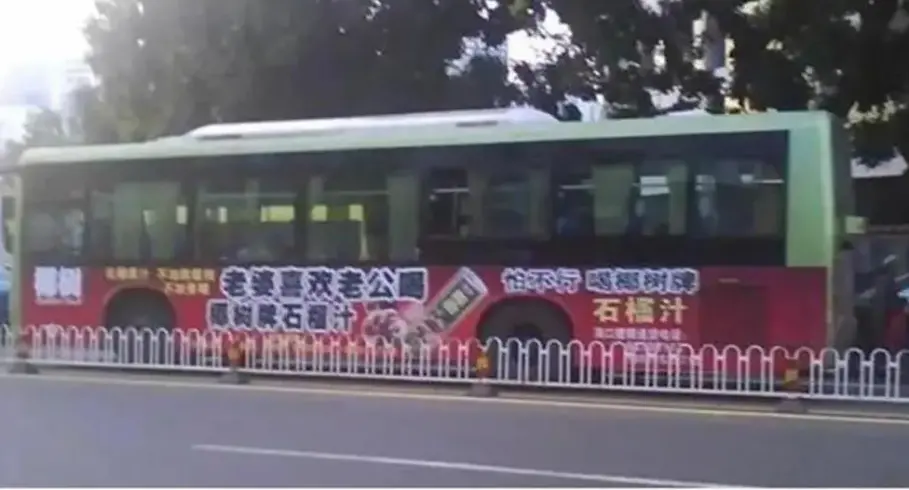 早在2009年,海口市来来往往的公交车上被椰树包场了,印着一行大字——“老婆喜欢老公喝椰树牌石榴汁”。