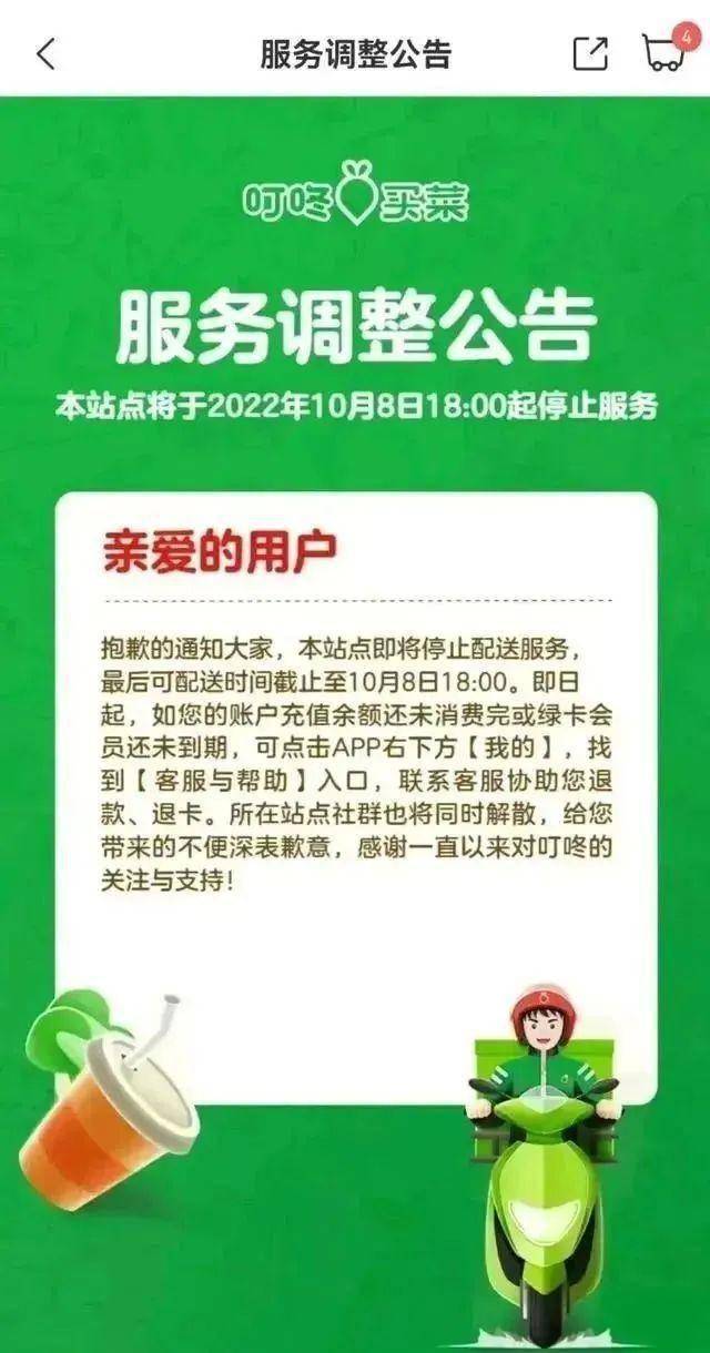 “本站点将于10月8日停止配送服务,所有站点社群也会同时解散”,这是近日厦门叮咚买菜用户收到的一则通知,也是今年继珠海、天津、中山、滁州、廊坊、唐山等之后的又一个停止服务的城市。
