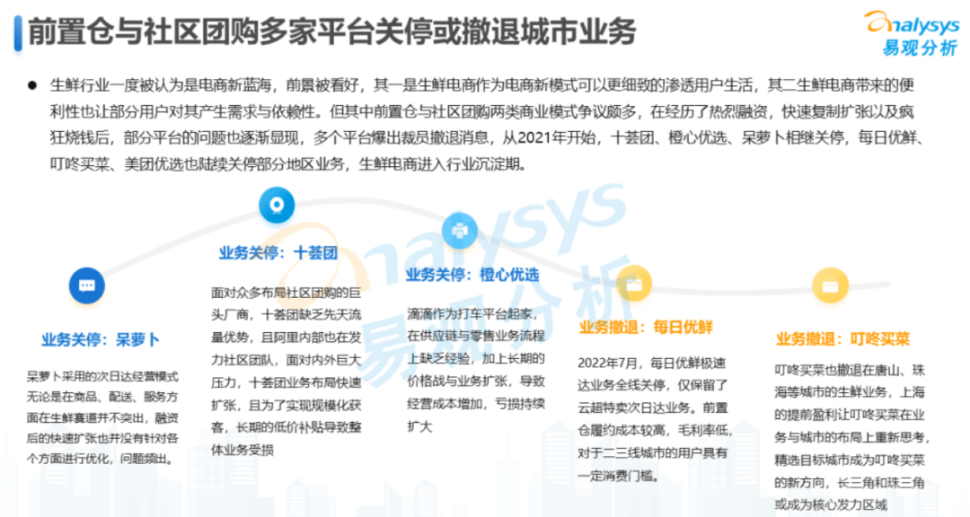 生鲜行业一度被认为是电商新蓝海,前景被看好,但从2021年开始,十荟团、橙心优选、呆萝卜相继关停,今年以来不断有企业宣布撤城关店,生鲜电商行业越来越安静。
