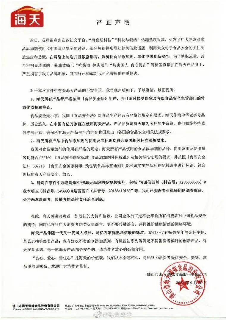 海天味业态度严厉地发表了一篇《严正声明》,称“今日我司留意到在各社交平台, 海克斯科技、科技与狠活话题热度很高.......妖魔化食品添加剂,黑化中国食品安全.......明显造谣的将有致癌、吃酱油掉头发等标签直接扣在海天产品上......”