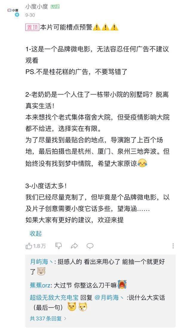 选择对长视频内容相对友好的B站,品牌赞助UP主首发的形式,为短片积蓄了传播的势能。同时,品牌在评论区带头吐槽并置顶的行为,大大降低了用户对广告的抵触心理,为品牌赢得好感。