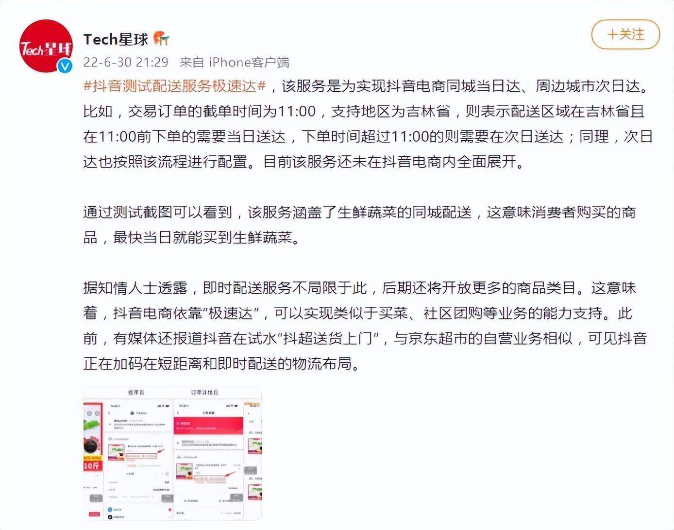 此外,在即时物流领域,抖音还推出了“极速达”,强调可实现商品同城当日达、周边城市次日达。