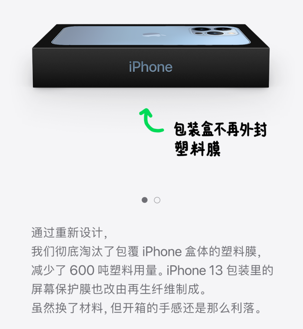 2022 年 4 月,苹果在官方微信公众号上公布了一份环保成绩单,表示因为淘汰了 iPhone 盒体塑料膜,苹果已经减少了 600 吨塑料用量;不再附赠充电器后,已经节省了 55 万吨的铜、锡和锌矿石。