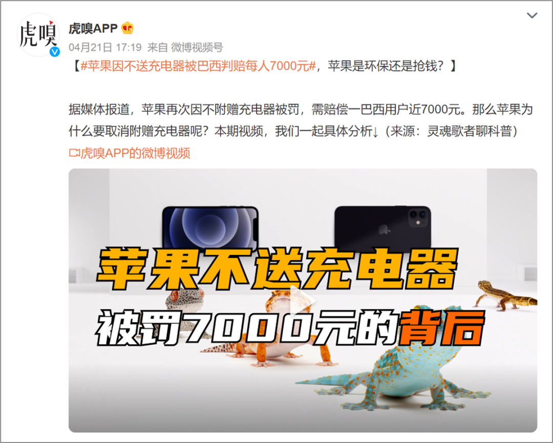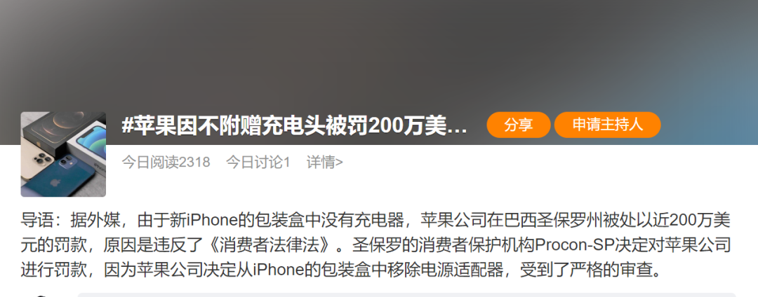 于是,2021 年 3 月,巴西圣保罗州的消费者保护机构就以 iPhone 12 系列没有充电器,违反《消费者保护法》为由,对苹果罚款 200 万美元。