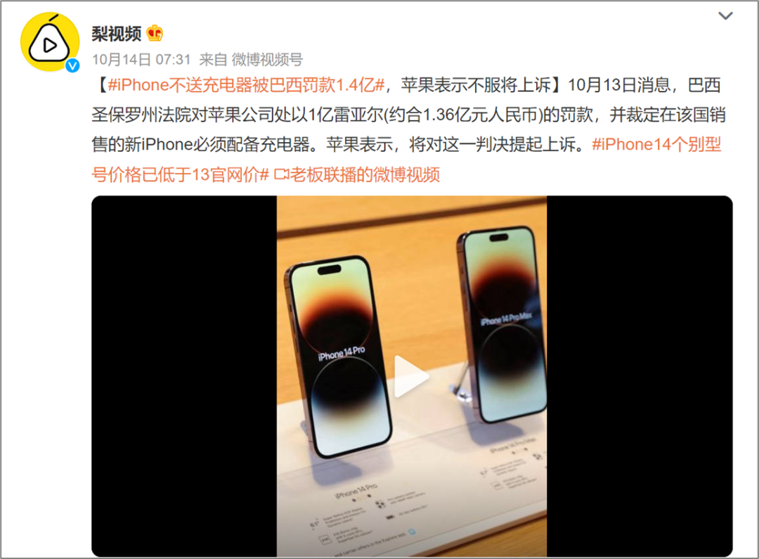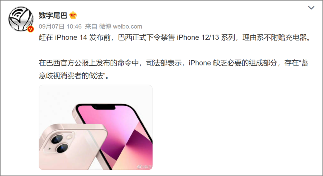 2022 年 9 月,也就是 iPhone 14 系列发布前夕,巴西政府给苹果公司来了一个狠的,宣布禁售没有充电器的苹果手机(包括 iPhone12/13 系列),并对苹果罚款 1227.5 万雷亚尔(约 1649.34 万元人民币)。