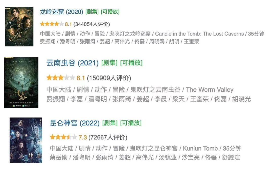 毒眸统计了三部《鬼吹灯》播出期间,在云合数据每日舆情榜TOP10以及霸屏榜TOP10的入榜次数后发现,三部作品的入榜次数呈明显的递减状态。三部作品的豆瓣评分人数,也越来越少,分别为破34万、破15万和破7万。