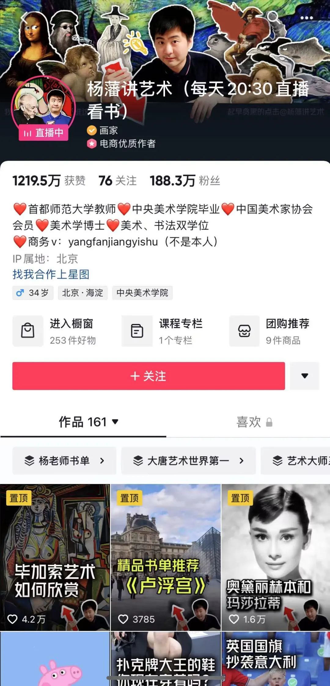“杨藩讲艺术”,是安亭在抖音上发现的宝藏达人,他总是能把专业、高雅,有时却又显得沉闷的美术知识讲得别开生面。