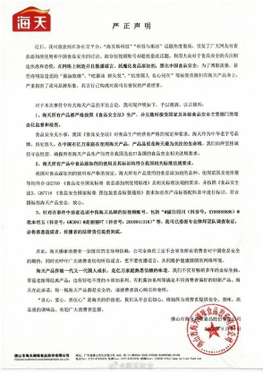 9月30日晚间,海天发布了第一份《严正声明》。称部分短视频账号借此机会“制造并散播谣言,妖魔化食品添加剂,黑化中国食品安全,已构成对公司名誉权的损害”,并以“产品依法生产”、“添加剂符合法规及标准”、“对造谣、传播者的法律责任追查到底”这三大部分内容“以正视听”。