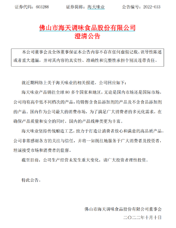 10月9日晚,海天的第三份《澄清公告》发出,这一次没了情绪和对抗,只是客观的陈述“公司均有高中低不同档次的产品,国内外均销售含食品添加剂的产品及不含食品添加剂的产品。在确保产品质量和安全的同时,国内的产品线种类更为丰富”的事实,显得稳重、大气了很多。