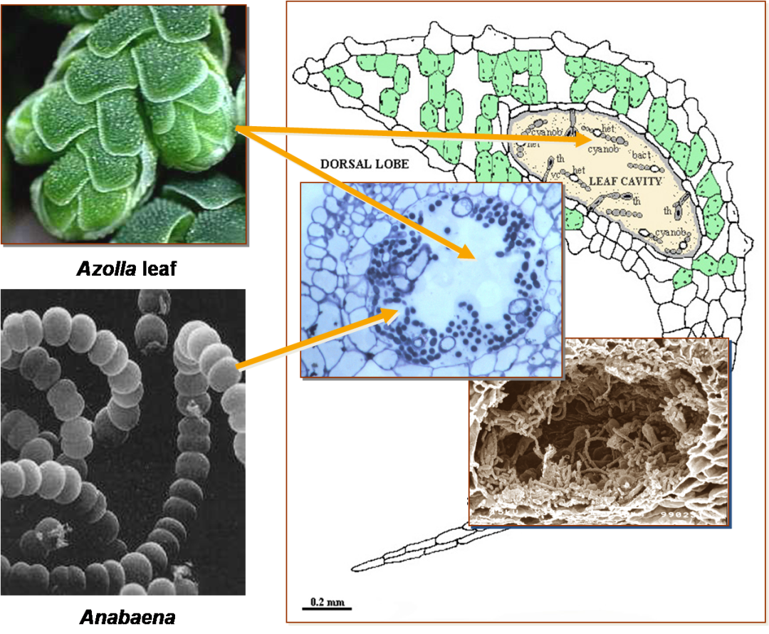 不过,满江红也不是独自做到固氮这一点的,它也靠一种神助攻——鱼腥藻属的蓝细菌(也叫蓝藻或蓝绿藻)Anabaena azollae。满江红的固氮技能点就是这种蓝细菌赋予的。