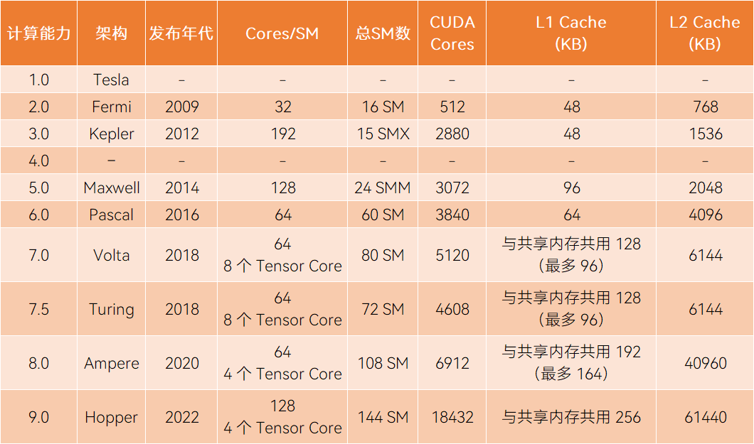 为了更好地应对竞争,英伟达每一代显卡的架构设计变化都非常大。经过统计英伟达每一代架构情况来看,性能提升的核心两要素流处理器(Streaming Multiprocessor,SM)和缓存(Cache)都有较大设计改动,这是为了在芯片有限的面积、功耗下,不断调整各种组件配置比例,通过制程工艺迭代,寻求最优解法。