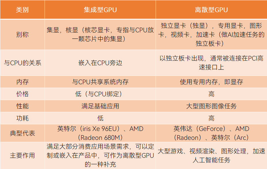 GPU根据接入系统的方式分为集成型GPU(Integrated GPU,iGPU)和离散型GPU(Discrete GPU ,dGPU)两种,前者就是我们日常所说的集成显卡/核芯显卡,后者就是我们日常所说的独立显卡,两种类型GPU均有各自的特点和使用场景。