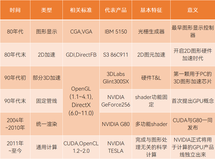 上世纪90年代,3D图形加速兴起。历史上第一块真正意义的3D图形加速卡Voodoo问世后,S3又推出第一款同时拥有2D和3D图形处理能力的显卡S3 Virg,此后行业便开始多点开花,逐渐诞生出NVIDIA的NV1、Matrox的Mlennium、Mystique、PowerVR的PCX1等优秀产品,一度显现出百家争鸣的盛况。繁华过后,便是残酷的大鱼吞小鱼式并购和行业整合,形成英伟达、AMD两家独大的格局。自此之后,GPU也开启了跨越式的迭代之路。