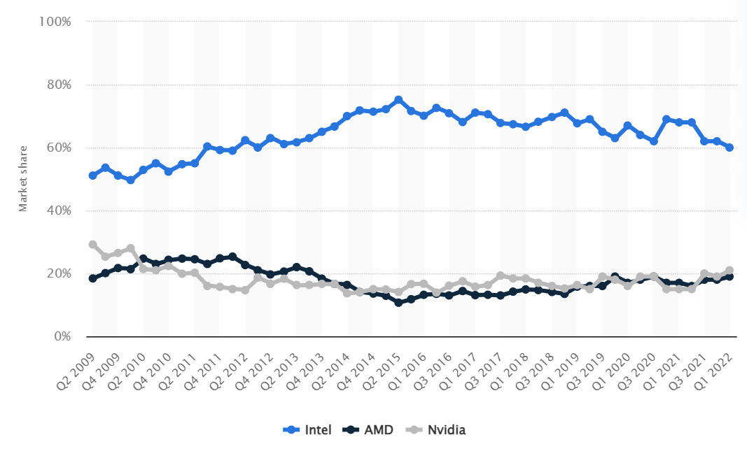 Jon Peddie Research(JPR)数据显示,2022年Q2,PC使用的GPU出货量(包括集成和独立显卡)为8400万块,其中英特尔GPU市场份额高达68%,主要归功于英特尔在台式机/笔记本电脑CPU集成大量核显;AMD以17%份额居于第二,这家公司既有核显也有独显,但核显明显占大头,独显只占整体PC市场约3%;英伟达则主攻独显市场,所以虽然看似只有15%市场份额,但基本称霸独显市场。