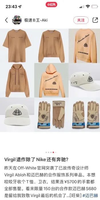 与这辆车同时亮相的还有Virgil设计师最后一个系列的户外主题系列服装,短袖T恤售价约3500元,卫衣5400元,帽子2800元,被戏称,这可能是打工人离迈巴赫最近的一次了。