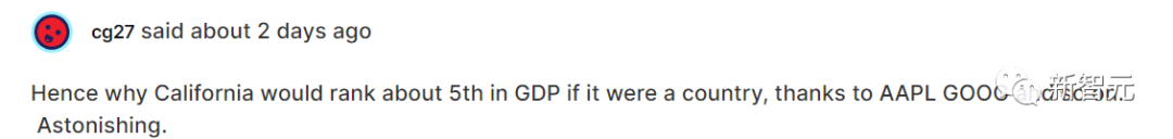 有网友顺便指出,如果加利福尼亚州是一个国家的话,GDP排名大概排名全球第五,仅次于美国、中国、日本、德国,毕竟苹果、谷歌等硅谷巨头实在太能赚钱了。