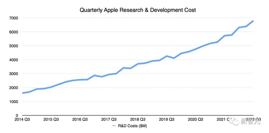 同时,苹果的研发支出逐渐增加,2022年第二季度达到68亿美元,足以打败排名第152位的黑山共和国(58亿美元)。