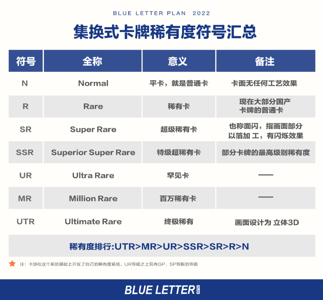 “万智牌”启发了日本游戏公司科乐美,它根据漫画家高桥和希的《游戏王》开发了同名集换式卡牌,并设计了一套更严密的稀有度体系,它分为N(nomal正常)、R(rare罕见)、SR(super rare 非常稀有)、SSR(superior super rare 超级稀有)、UR(ultra rare极度稀有),不同等级的卡片发行量有严格的限制。把单张卡片的稀缺程度直接印出来,让玩家的及时满足感来得更强烈。