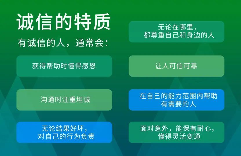 职场中的诚信表现为多种行为特质,如诚实、忠诚、正直、有责任感等。它还包括认真对待自己在工作中做出的承诺——以积极主动的态度,诚实协调自己的工作时间安排,并坚持一致的个人与工作价值观。也就是说,做出的承诺会信守,无法做到的会拒绝。