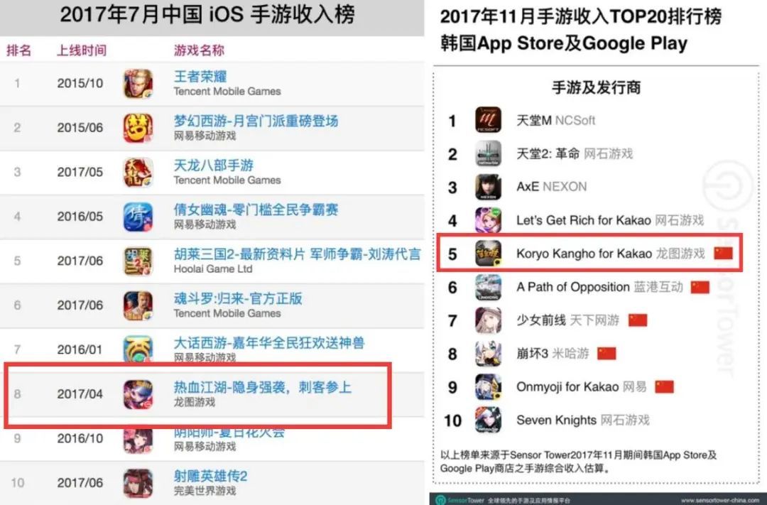 《剑与魔法》和《奇迹:最强者》分别冲到过畅销第6和第3的位置,前者双日流水破千万,后者首月流水破亿;《热血江湖》上线首月流水过亿,且冲到了中国iOS手游收入第八,根据Sensor Tower数据显示,在2017年11月有五家中国手游公司冲上韩国手游收入榜前10名,其中排名最高的就是龙图游戏的《热血江湖》。