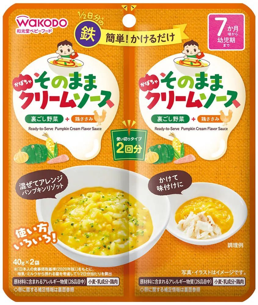 如日本专业婴幼儿食品品牌和光堂的奶油南瓜调味酱,含有三种蔬菜,来源于鸡肉的优质蛋白质及丰富的铁元素,只需要将酱汁和其他食材混合起来简单加热,就能制作出美味又营养的婴幼儿辅食。且独立小包装方便控制用量,省时省力,大大减轻了宝妈制作辅食的工作量。