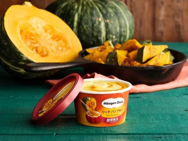 哈根达斯同样也是选用了北海道的惠比寿南瓜,推出了季节限定的南瓜迷你杯。在奶香浓郁的冰淇淋中加入了烤制的南瓜泥,增添了南瓜温和浓郁的风味。这在不少消费者的评价中成了南瓜杯最亮眼的神来之笔,正是烤南瓜酱才没有被浓郁的奶味过分掩盖,反而凸显了南瓜温柔的甜味。