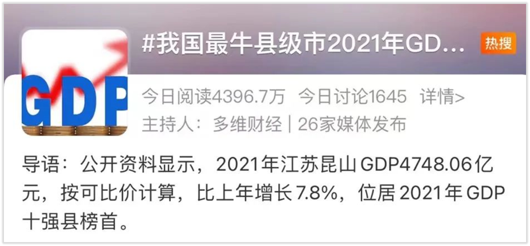 经济最强的就是昆山,在十强县中位居榜首,还以“我国最牛县级市2021年GDP超4700亿”霸占了微博热搜榜单。