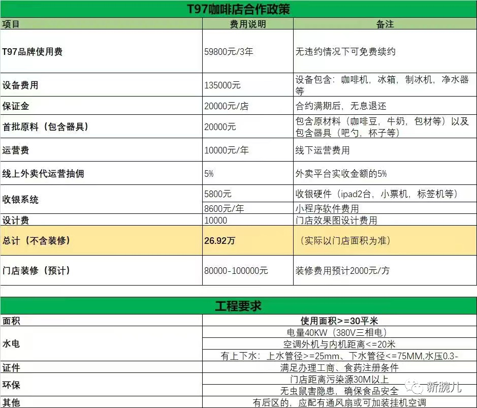 先看加盟收费细节,我们联系到了T97咖啡招商人员,对方发来的费用包括品牌使用费59800元/3年、设备费用13.5万、保证金2万等,共计26.92万。另外还有装修费是2000元/方,按照他们规定的门店面积,装修费用大约在8万-10万元。