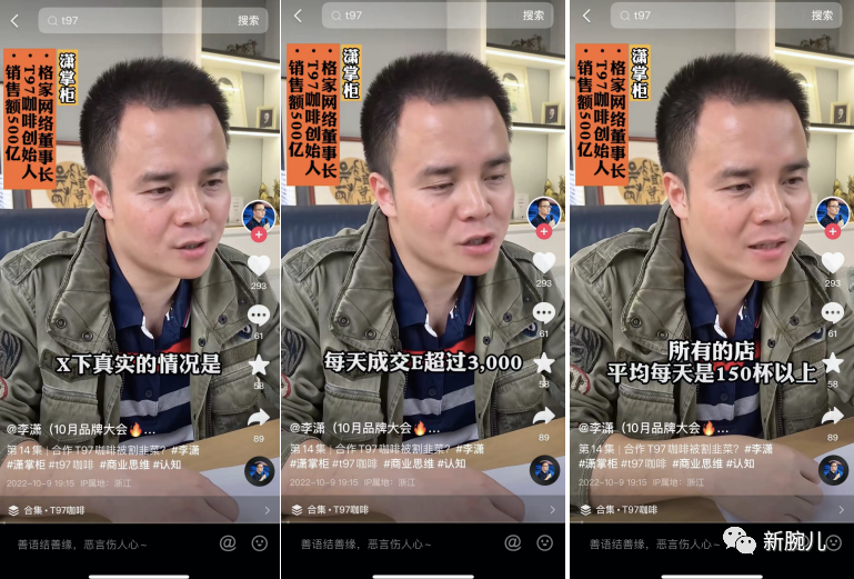李潇在一条视频中回应割韭菜的问题,“现在T97真实的线下经营情况是,每天成交额超过3000,在单店没有额外推广的情况下,只靠总部推广,每家店是150杯以上。”他还说道,“在6月15日,全国真实数据是1600多(家店),那个时候是(每天销售)100杯不到。”